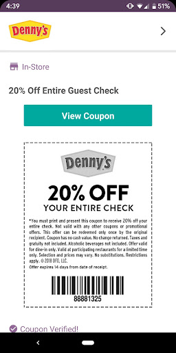 Denny's Restaurant Coupons & Promo Codes - September 2022 These Denny's Restaurant promo codes have expired but may still work. $5 Off code $5 Off $20+ Order ...F20 Show Coupon Code 15% Off code 15% Off Sitewide Click through and tap 'copy & go' to redeem 15% off storewide at Denny's Restaurant. ... OFF Show Coupon Code Free Delivery w/ All Orders
