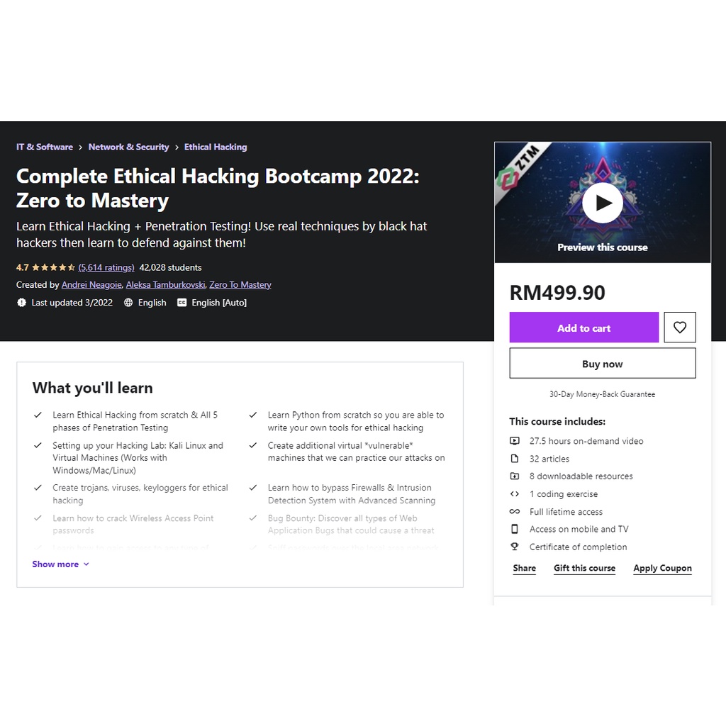Python Hacking Course For Ethical Hackers - Udemy Coupon Welcome this great course where you'll learn python programming and ethical hacking at the same time, the course assumes you have NO prior knowledge in any of these topics, and by the end of it you'll be at a high intermediate level being able to combine both of these skills and write python programs to hack into computer systems exactly the same way that black hat hackers do, and use the ... Learn Python and Ethical Hacking From Scratch Up to 95% Off Udemy Courses - View Coupon. Categories. Blog; Write a Review; About; Nerd Gifts; Contact; Categories Blog Write a ... Or looking for more detail on 's Learn Python and Ethical Hacking From Scratch? Feel free to chat below. Join CourseDuck's Online Learning Discord Community.